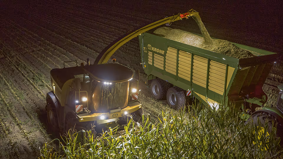 Seks forkomprimeringsvalser og et avstand på 820 mm mellom den fremste valsen med metalldeteksjon og den bakerste valsen forbedrer ikke bare forkompresjonen, men beskytter også knivene bedre mot metallgjenstander, selv ved høy inntakshastighet. Den hydrauliske drivakselen justerer automatisk LOC i henhold til avlingens modenhet, som registreres av KRONE AutoScan-sensoren. Hvis motorhastigheten faller under 1 200 o/min når belastningen øker, stoppes skjærebordet og innmatningssystemet automatisk mens snittetrommelen fortsetter å rotere – fordi blokkeringer forårsaket av lave hastigheter koster tid og penger.