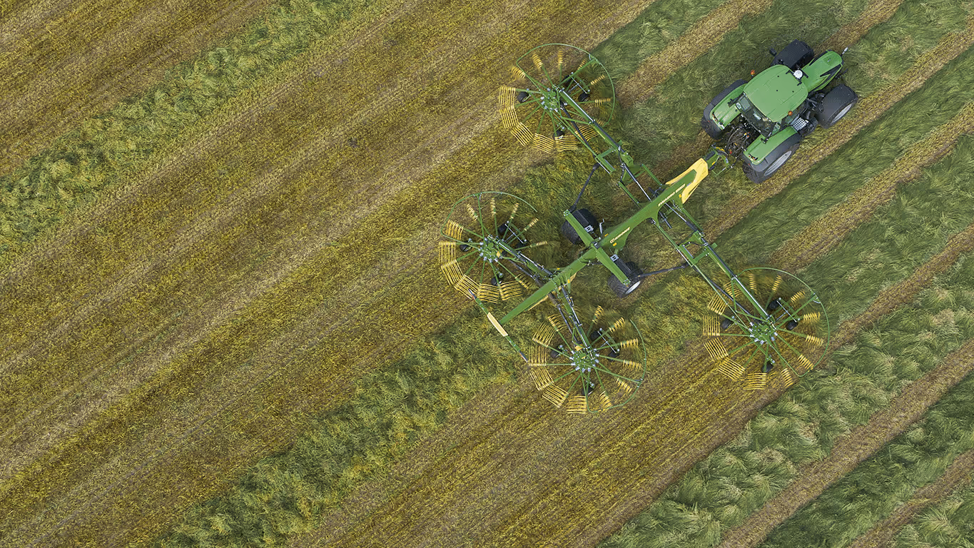 Hjulene under KRONE Swadro-rotorene mister aldri kontakten med bakken, ikke engang i det mest ujevne terrenget. Størst mulig kontaktflate og svingradius, kombinert med passende dekk, sikrer at ingen kniv blir liggende igjen på gressdekket og at gressdekket ikke blir skadet. Rene og intakte gressdekker er grunnlaget for fôr av topp kvalitet, også ved neste slått.